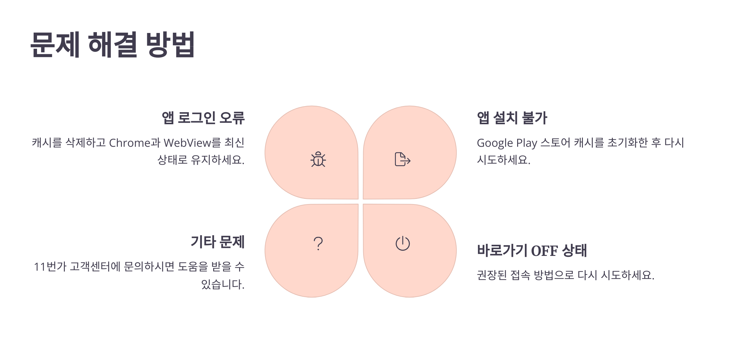 - 앱 설치 불가: Google Play 스토어 캐시 초기화 후 재시도